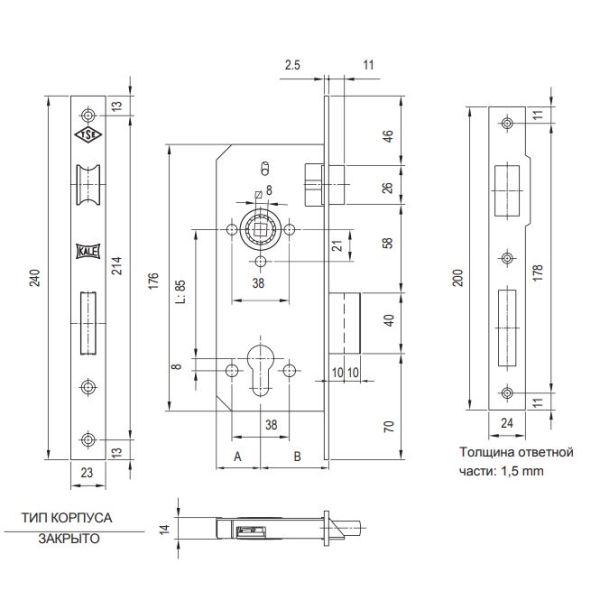 Kale Корпус замка 152R-85BS45-23NP-(SP,Ros) (без цилиндра) STB 152R4500450