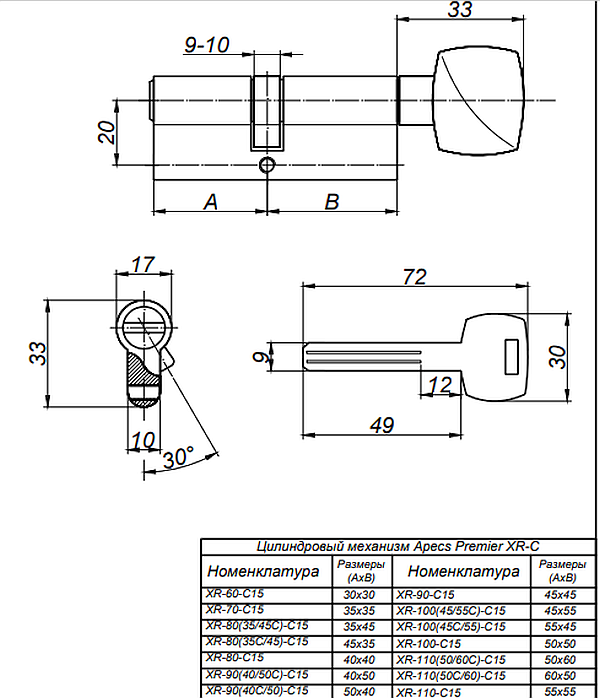 Механизм цилиндровый Premier XR-90(40/50С)-C15-NI