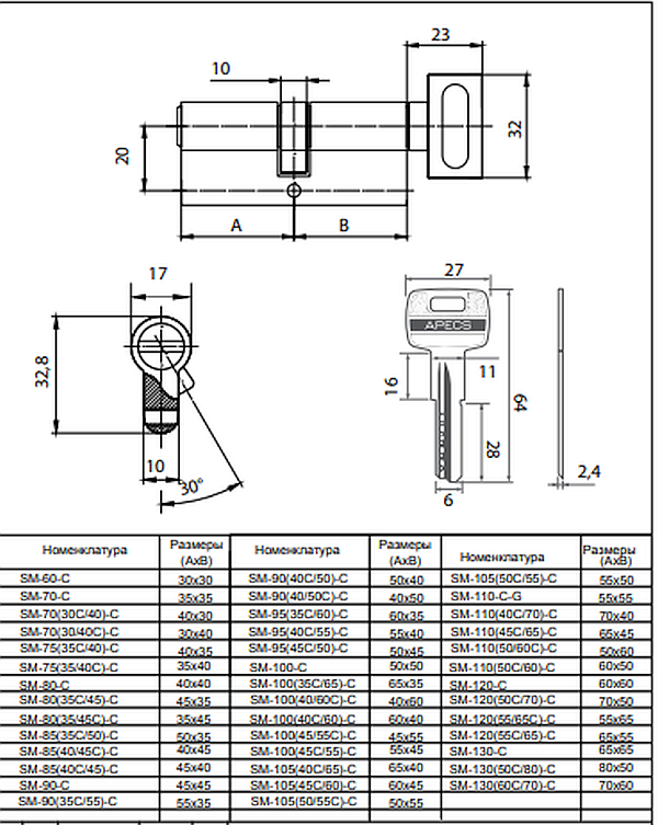 Механизм цилиндровый SM-90 (35C/55)-C-G Апекс
