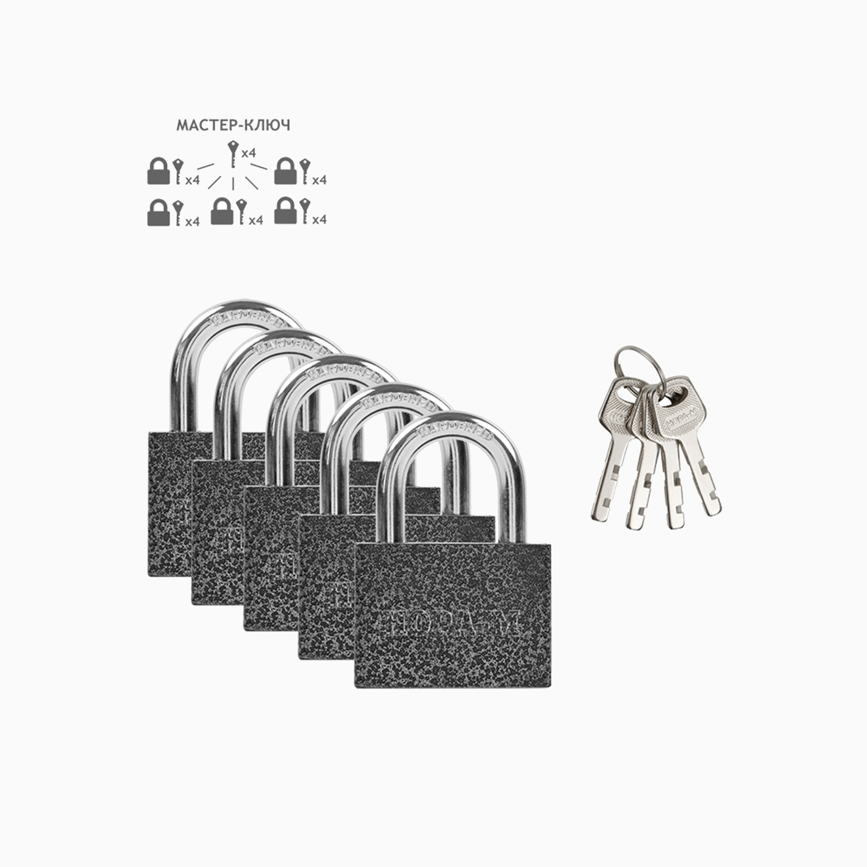 Н-М Замки навесные мастер-система 1105-60 (5 замков по 4 ключа+4 мастер ключа универсальных)